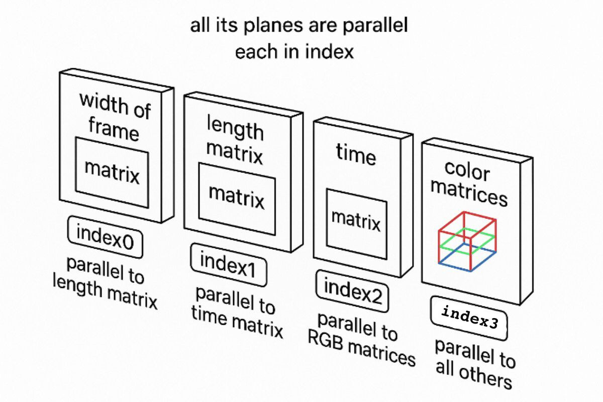 تخيّل إنك بتتفرج على فيلمك المفضل—ده مش مجرد صورة ثابتة، ده سلسلة من الصور بتيجي ورا بعض بسرعة بتديك إحساس بالحركة والزمن والألوان. الفيلم ده ممكن نمثله بـ tensor ليه 4 أبعاد، وكل بُعد من دول ليه دور مهم زي قطعة ليجو أساسية في الشكل النهائي. تعالوا نفصّصها مع الصور اللي في خيالنا: